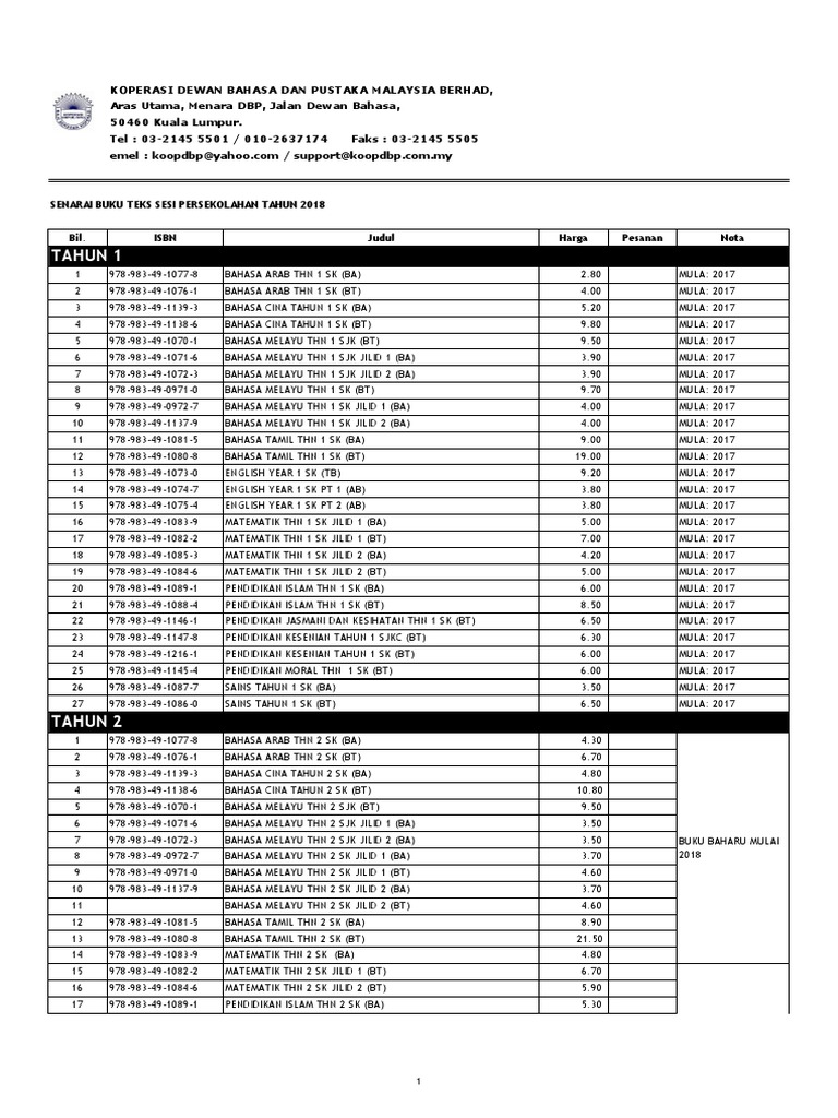 Senarai Judul Buku Teks Terbitan Baharu BTB Dan Buku Teks Common European Framework of Reference CEFR Bagi Kegunaan Tahun 2018. Bilik pelupusan 1 bilik spbt 1 dokumen 1 muat turun 1 sekolah bantuan kerajaan 1 sekolah kerajaan 1 sksm 3 spbt. Kodbuku judul namapenerbit harga thnting zonpembekalan 1 ba211029 bahasa arab tahun 1 ba dewan bahasa dan pustaka 280 d1 seluruh negara 2 bt211029 bahasa arab tahun 1 bt dewan bahasa dan pustaka 400 d1 seluruh negara 3 da031001 bahasa cina tahun 1 sjkc ba jilid 1.